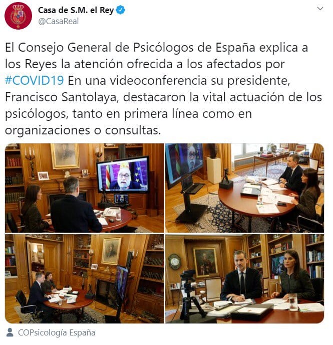 El 13 de mayo, el presidente del Consejo General de la Psicología, Francisco Santolaya Ochando, mantuvo una videoconferencia con Sus Majestades los Reyes para detallar las actuaciones realizadas por parte del COP en el marco de la actual emergencia sanitaria generada por el COVID-19.