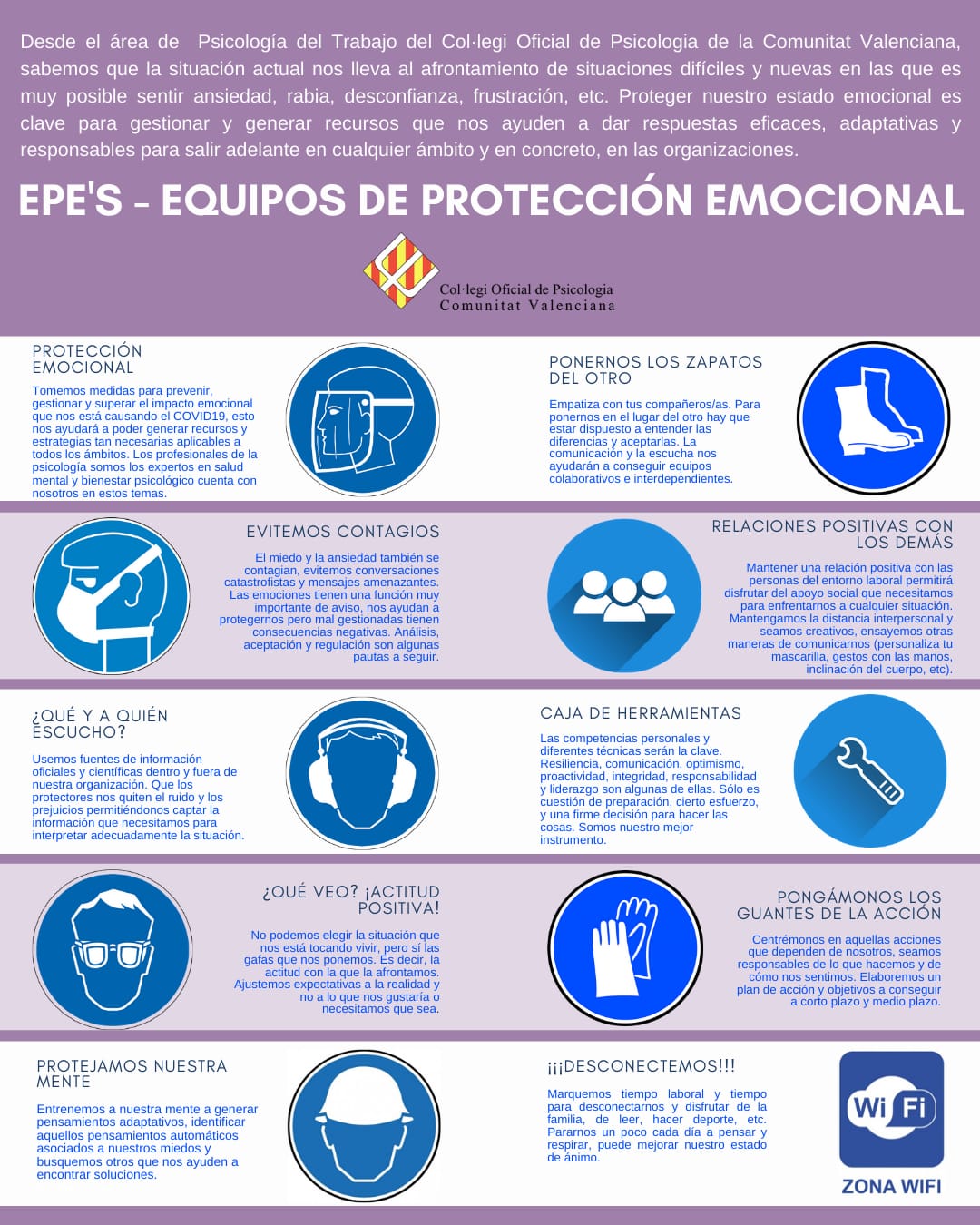 El Colegio Oficial de Psicología de la Comunidad Valenciana ha elaborado una infografía en la que, de forma muy gráfica, nos muestra los equipos que podemos utilizar para proteger nuestro estado emocional.
