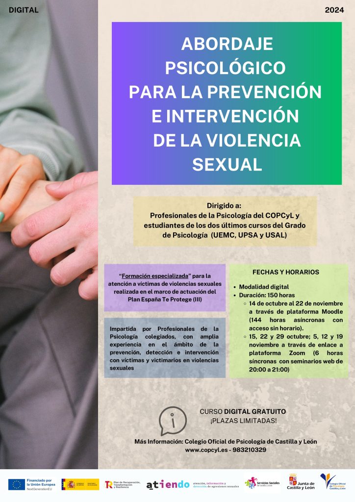El Colegio Oficial de Psicología de Castilla y León organiza del próximo 14 de octubre al 22 de noviembre, en modalidad online, una formación gratuita sobre el abordaje psicológico para la prevención e intervención de la violencia sexual. (más información e inscripciones aquí).