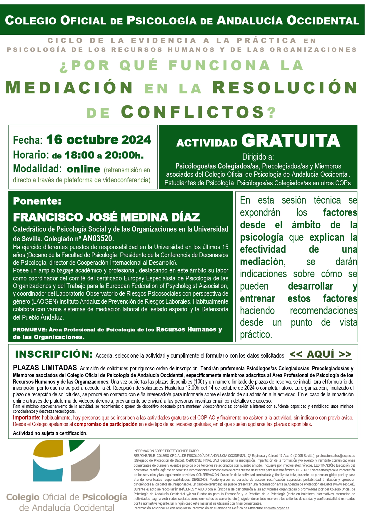 El Colegio Oficial de Psicología de Andalucía Occidental organiza esta sesión formativa gratuita el próximo 16 de octubre de 18:00 a 20:00 horas. (información e inscripciones aquí)