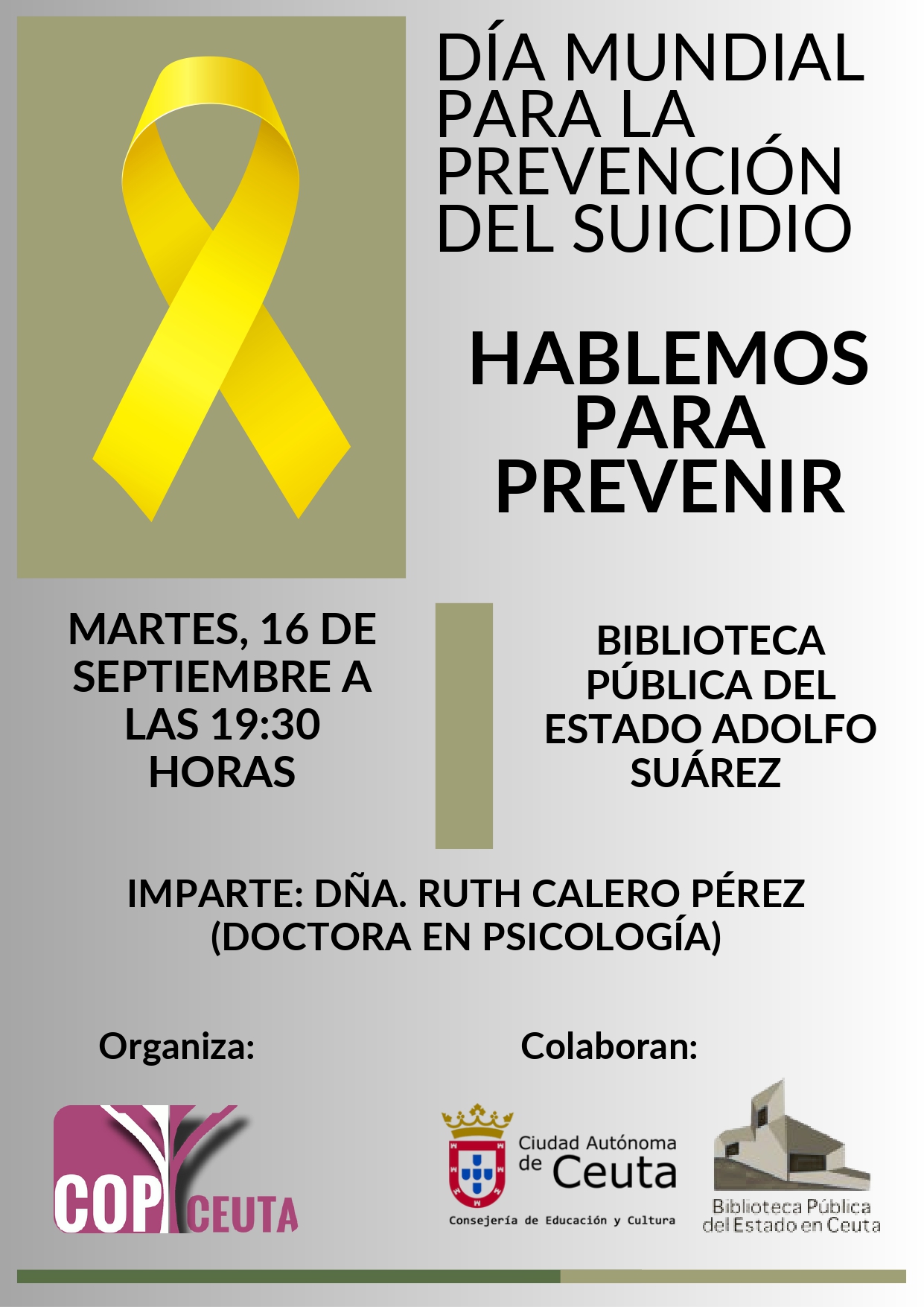 Hoy martes 16 de septiembre a las 19.30 horas en la sala de usos múltiples de la Biblioteca Pública del Estado Adolfo Suárez la Doctora en Psicología, Dña Ruth Calero Pérez, miembro del COPCE, impartirá una charla con motivo de la celebración del Día Mundial para la prevención del suicidio.