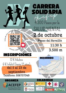 Nos complace anunciar que la Asociación ACEFEP celebrará el domingo día 2 de octubre, la IX Carrera Solidaria “4.300 pasos por la Salud Mental”. Esta iniciativa se encuadra en las actividades que se están organizando para el Día Mundial de la Salud Mental 2022 bajo el lema “Dale Like a la Salud Mental. Por el derecho a crecer en bienestar”