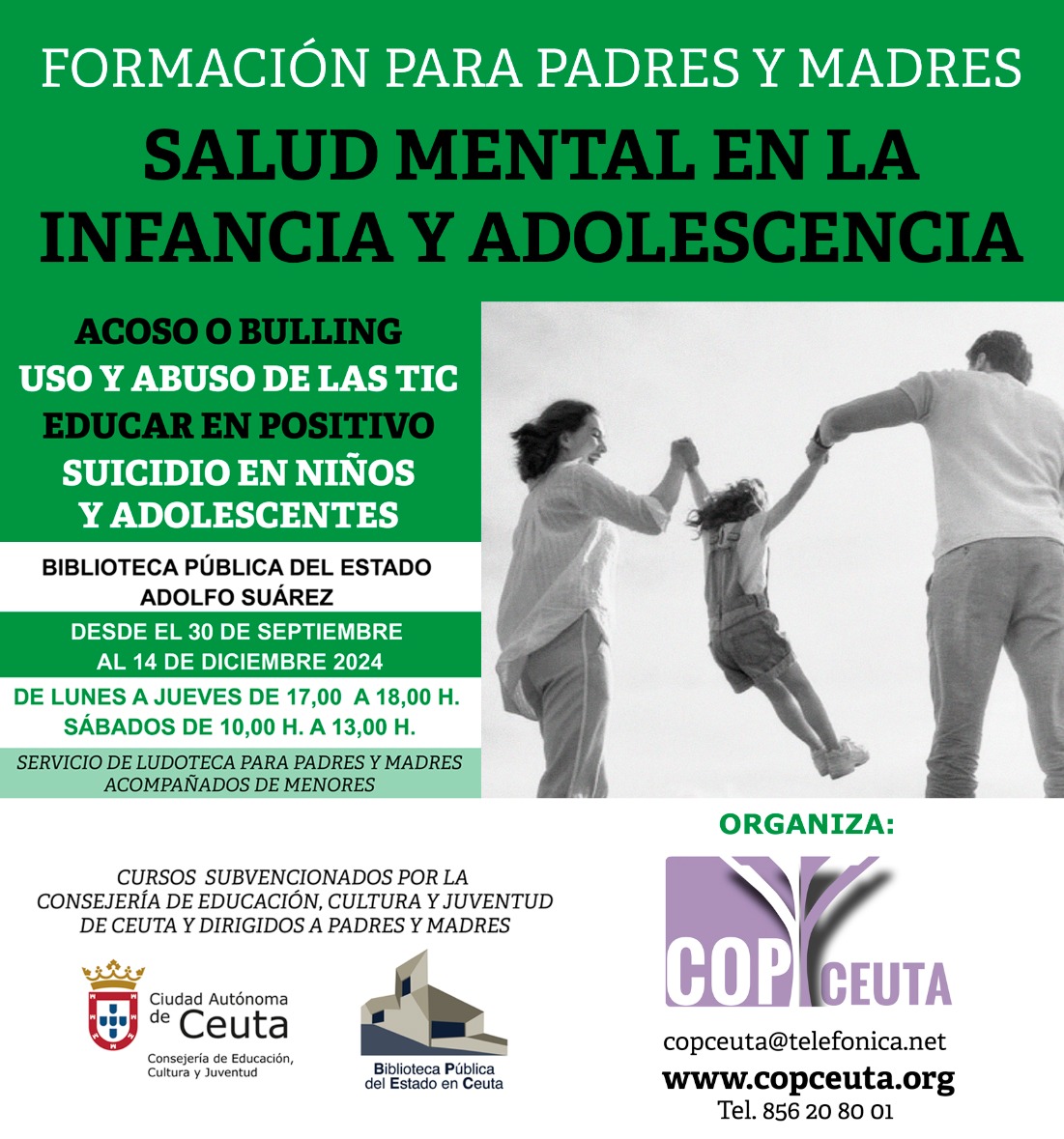 El COPCE impartirá formación dirigida a padres y madres sobre Bulling, Educación en positivo, uso y abuso de las TICs y suicidio desde el 30 de septiembre al 14 de diciembre de lunes a jueves en la sala de usos múltiples de la Biblioteca Pública del Estado Adolfo Suárez. (acceso a noticia 1 aquí). (acceso a noticia 2 aquí) (acceso a entrevista aquí desde minuto 5:00 a 25:00). Las jornadas también podrán seguirse vía online, para lo cual es necesario solicitar una clave de acceso al correo copceta@telefonica.net. (acceso a nota de prensa aquí).