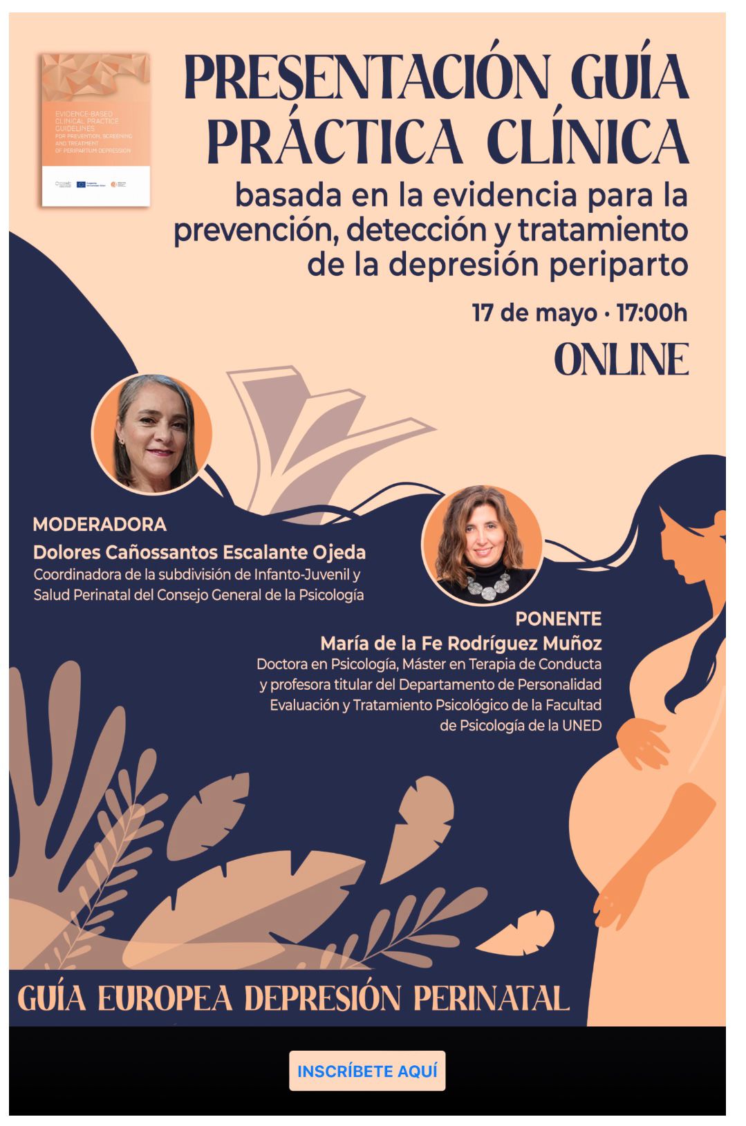 El próximo 17 de mayo a las 17:00 horas en modalidad on line se llevará a cabo la presentación de la Guía Europea de Depresión Perinatal. La presentación contará con la ponencia de Dña Mª de la Fe Rodríguez Muñoz (Dra en Psicología y Máster en Terapia de Conducta), ejerciendo Dña Dolores Cañossantos Escalante Ojeda (Coordinadora de la Subdivisión de Infanto-juvenil y Salud perinatal del Consejo General de la Psicología y Decana del COPCE) de presentadora y moderadora del acto. (Inscripciones aquí)